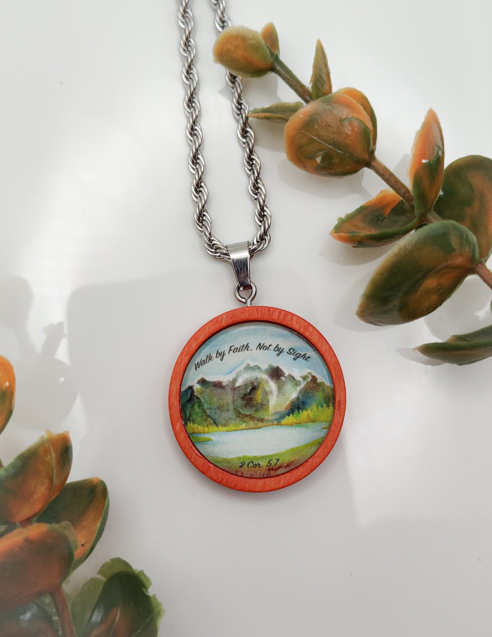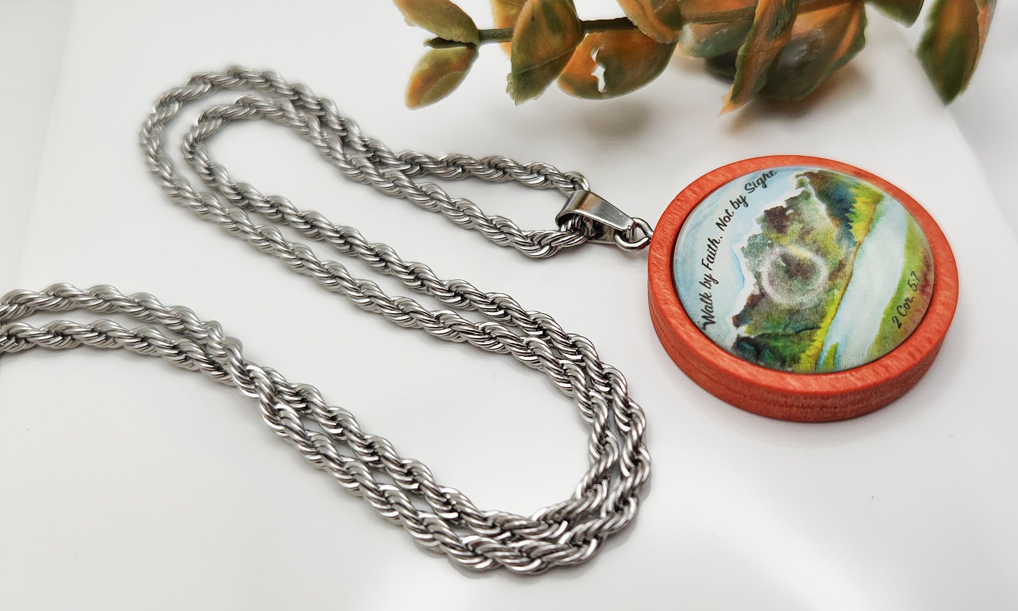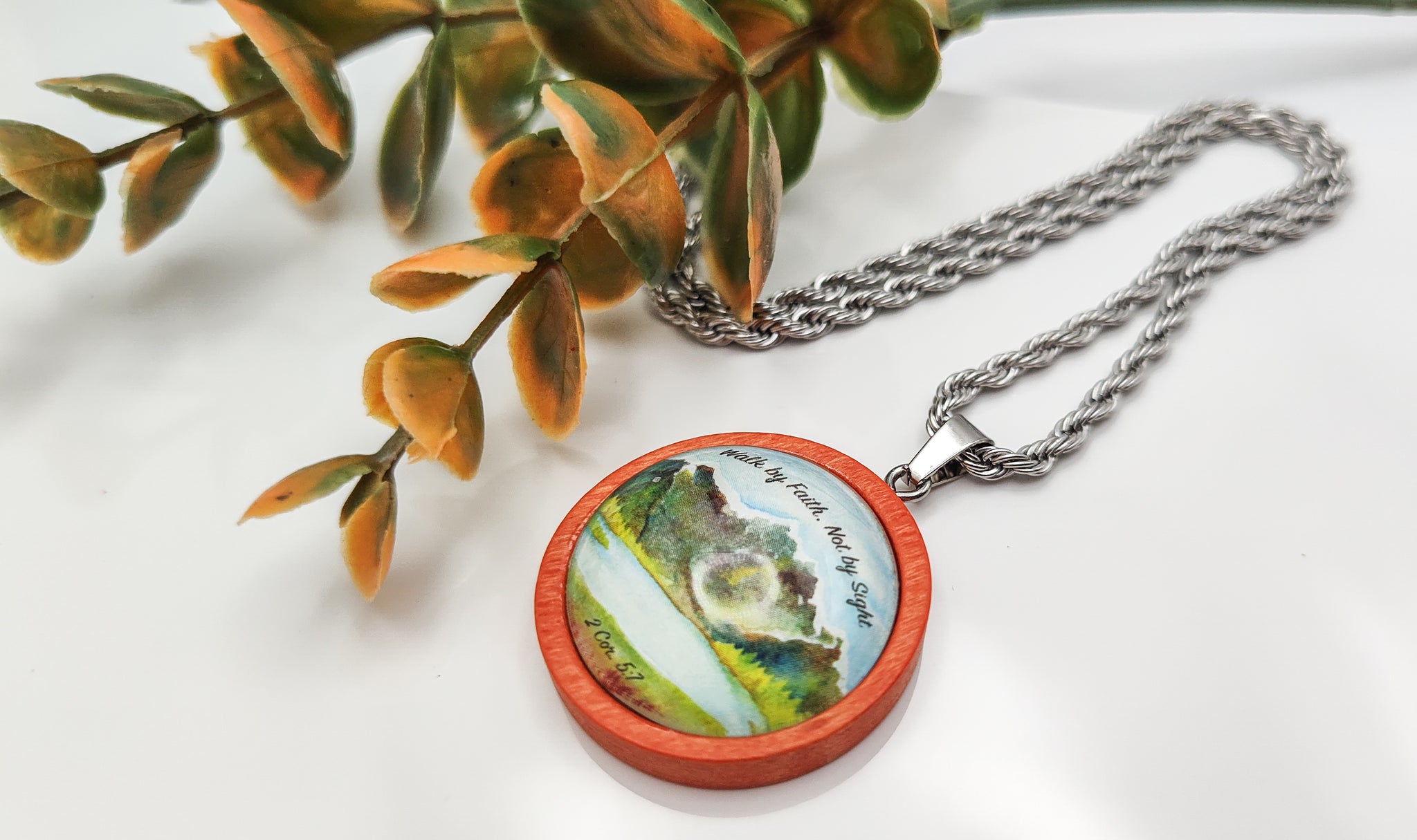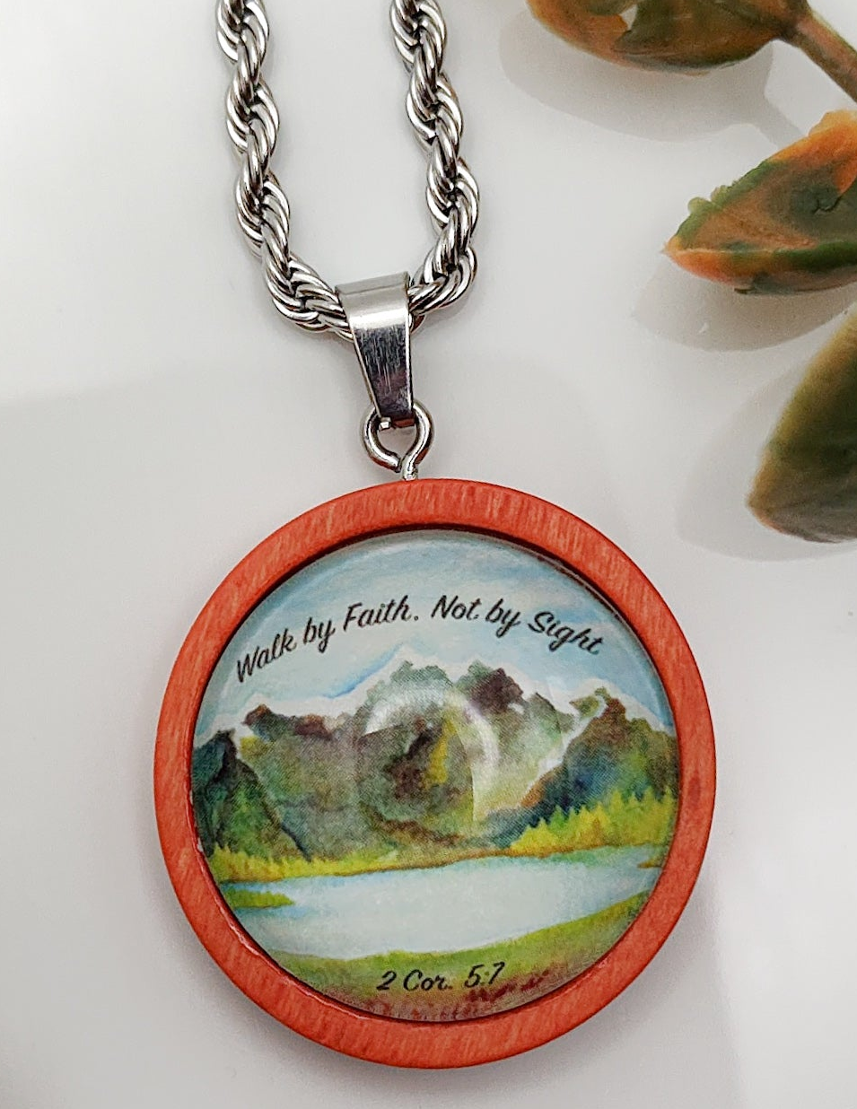 Encouraging pendant necklace with bible scripture 2 Cor. 5:7 "Walk By Faith, Not By Sight". Pendant is handcrafted measuring 25 mm or 1 inch round, about the size of a quarter.