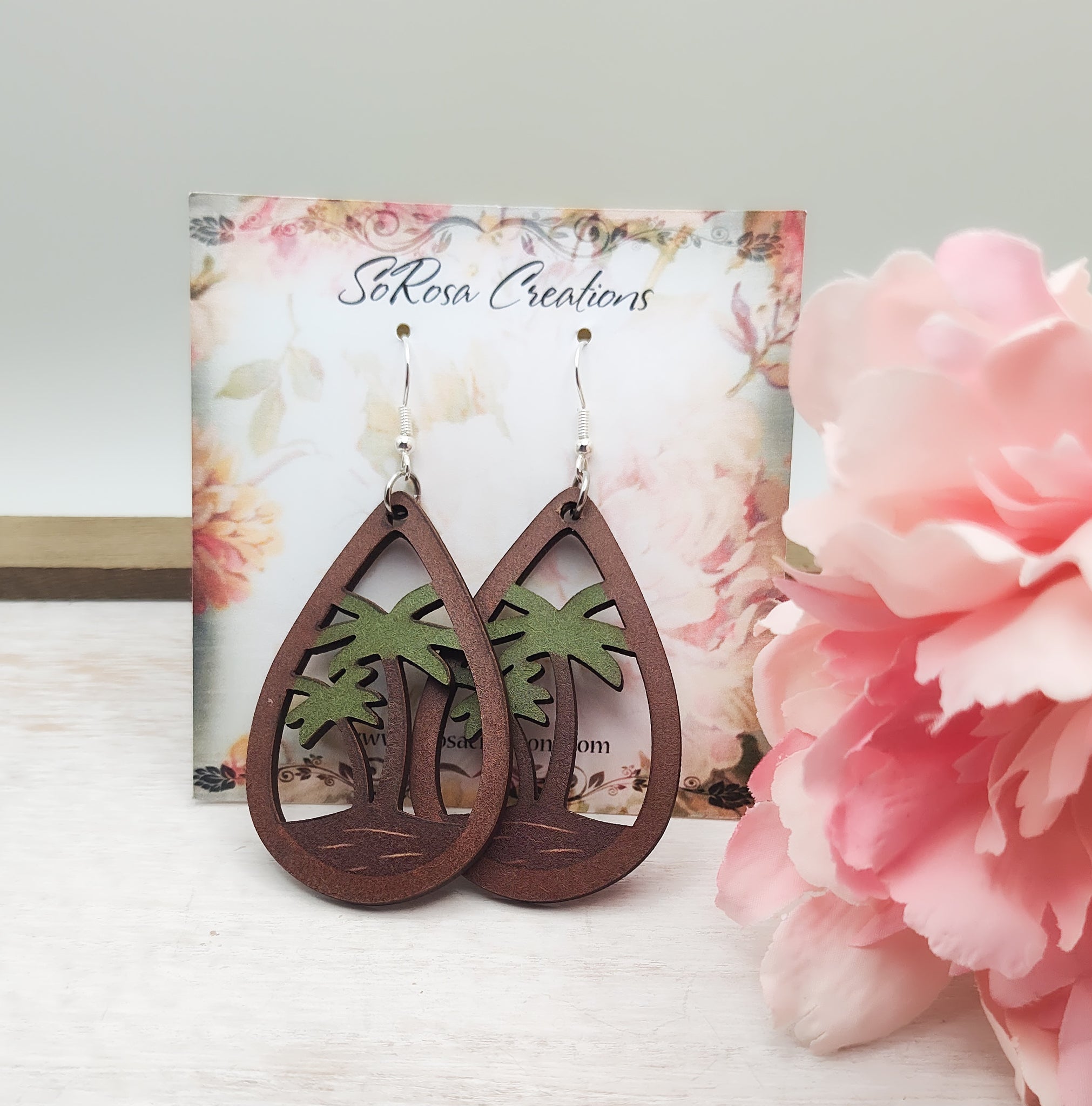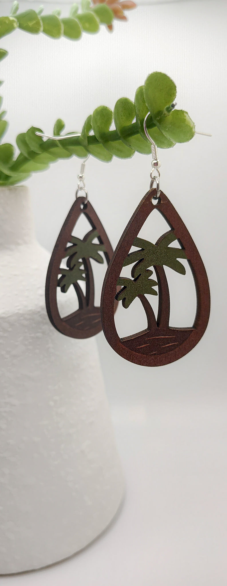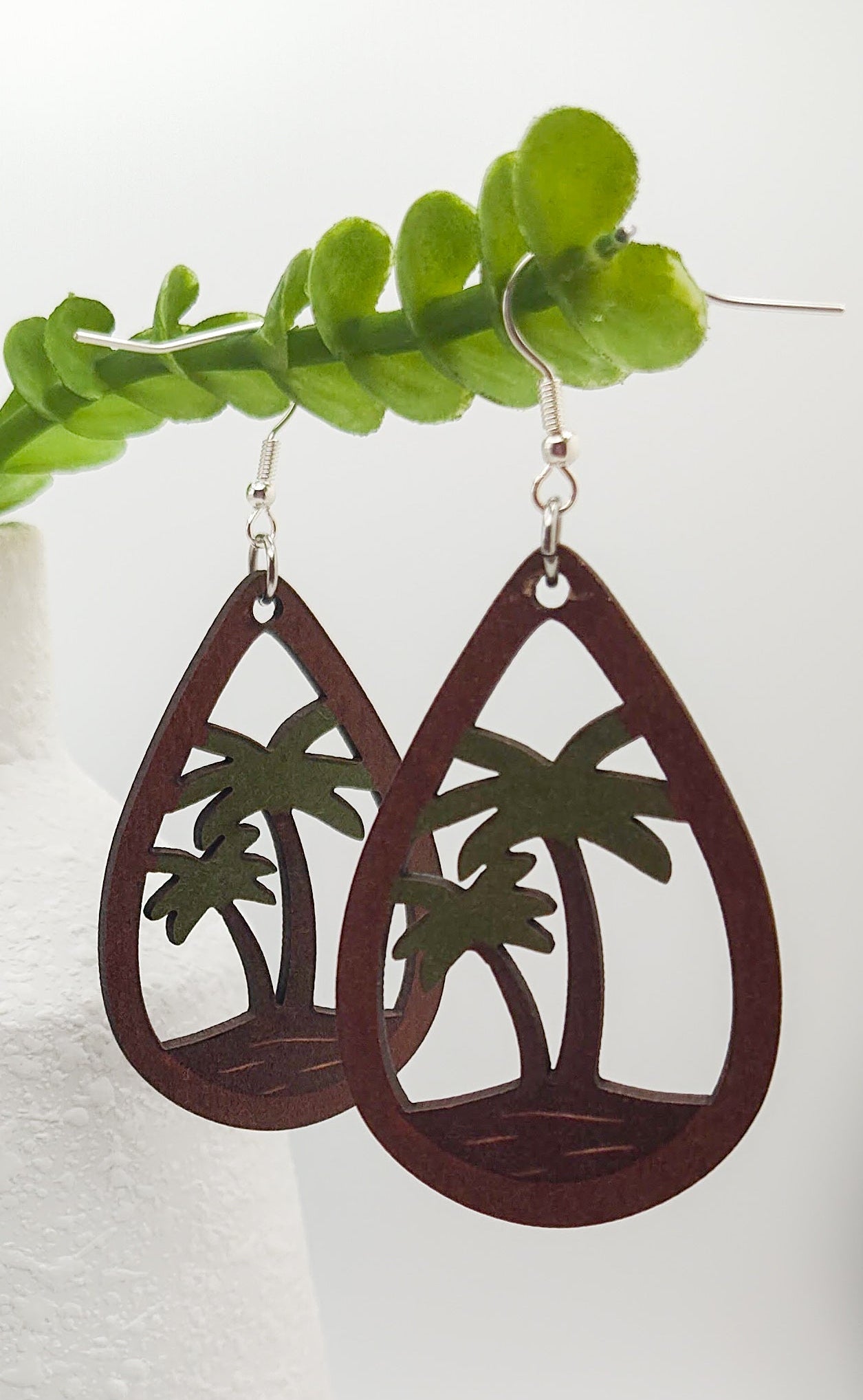 Pictured is a beautiful pair of wooden palm tree earrings. They hang on a 925 sterling silver french earring hook.