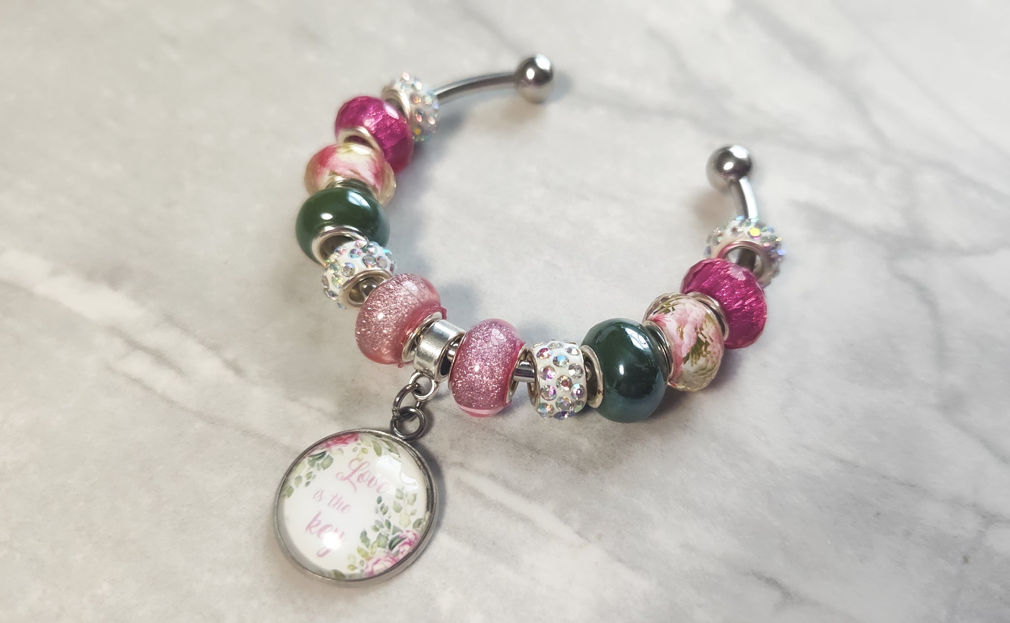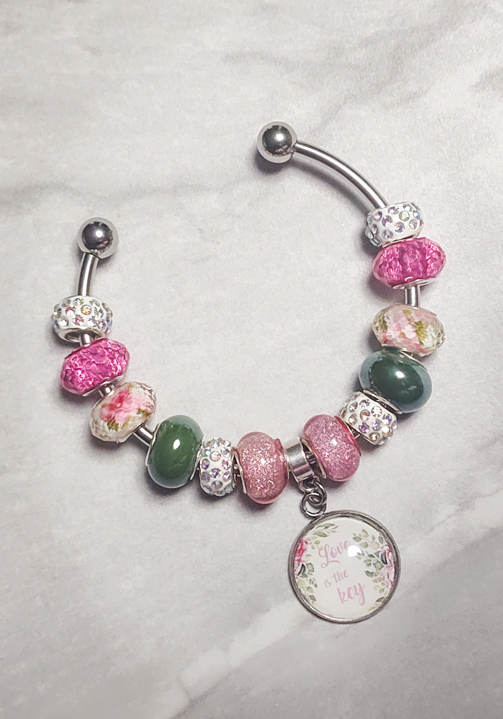 Adjustable 316 L stainless steel 3mm bangle bracelet. The wording on the bezel says "Love is the key". It is handcrafted measuring 20mm round, about the size of a nickel. The bezel is set into a silver bezel and covered with a rounded dome to add depth and luster image.