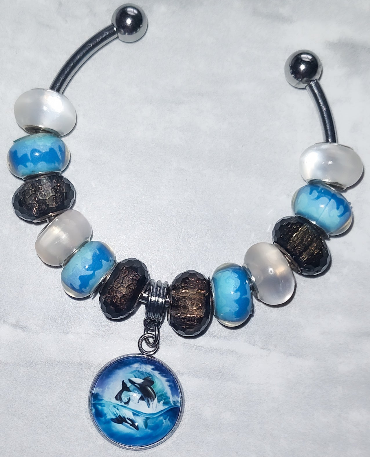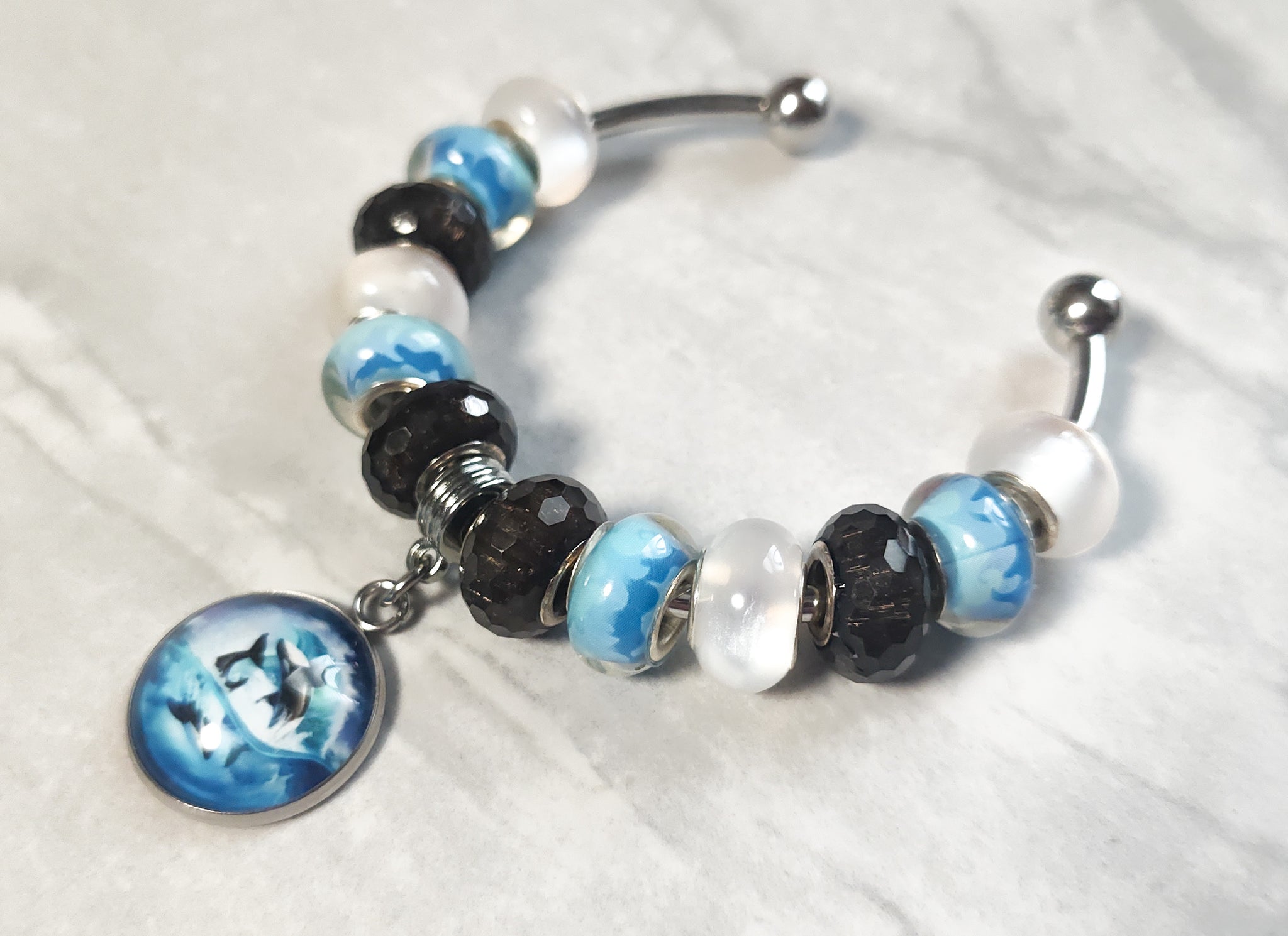 Adjustable 316 L stainless steel 3mm bangle bracelet. The image on the bangle is 2 dolphins splashing in the water. It is handcrafted measuring 20mm round, about the size of a nickel. The bezel is set into a silver bezel and covered with a rounded dome to add depth and luster image.