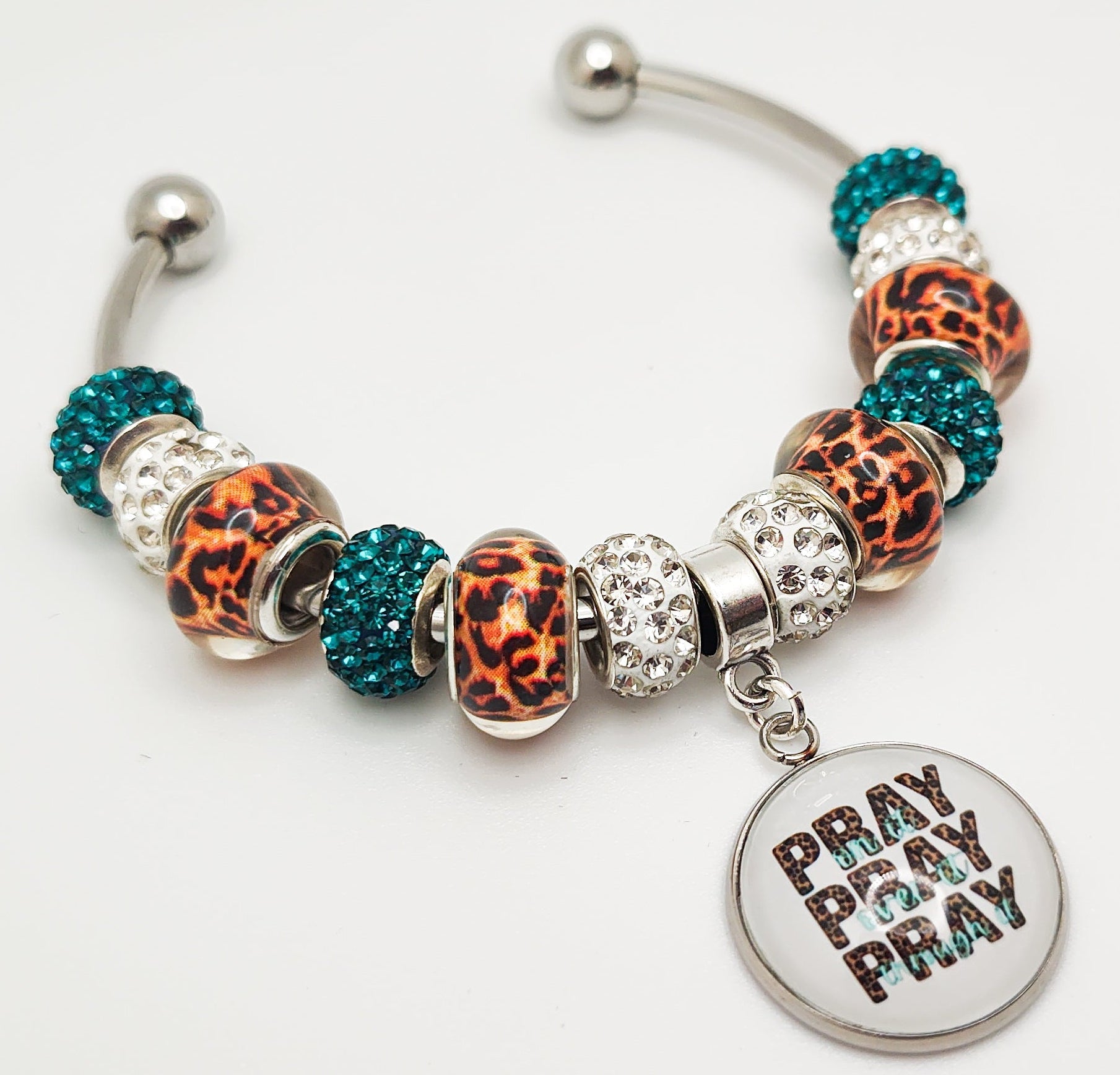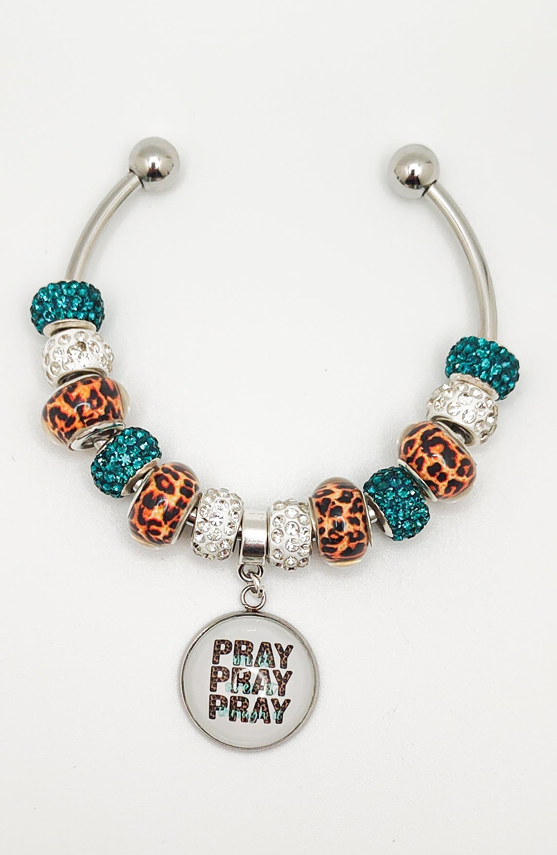 Adjustable 316 L stainless steel 3mm bangle bracelet. The wording on the bangle, says "PRAY". It is handcrafted measuring 20mm round. The bezel is set into a stainless steel bezel and covered with a rounded dome to add depth and luster image.